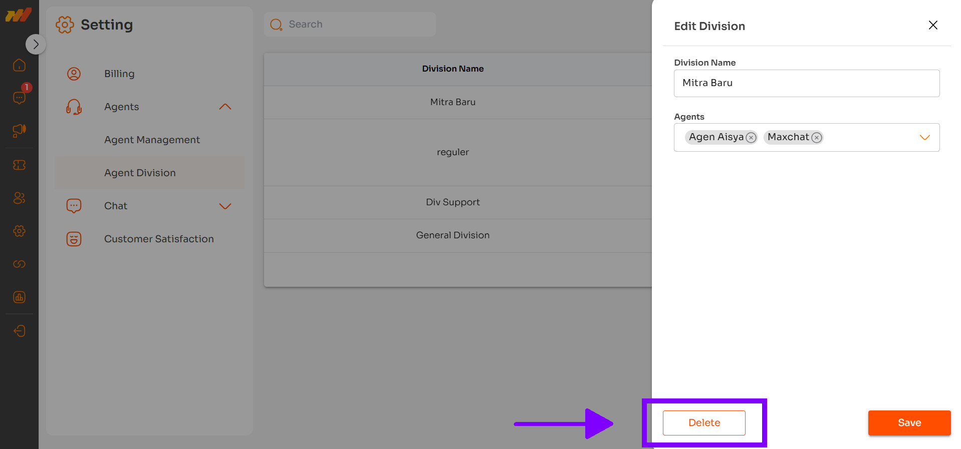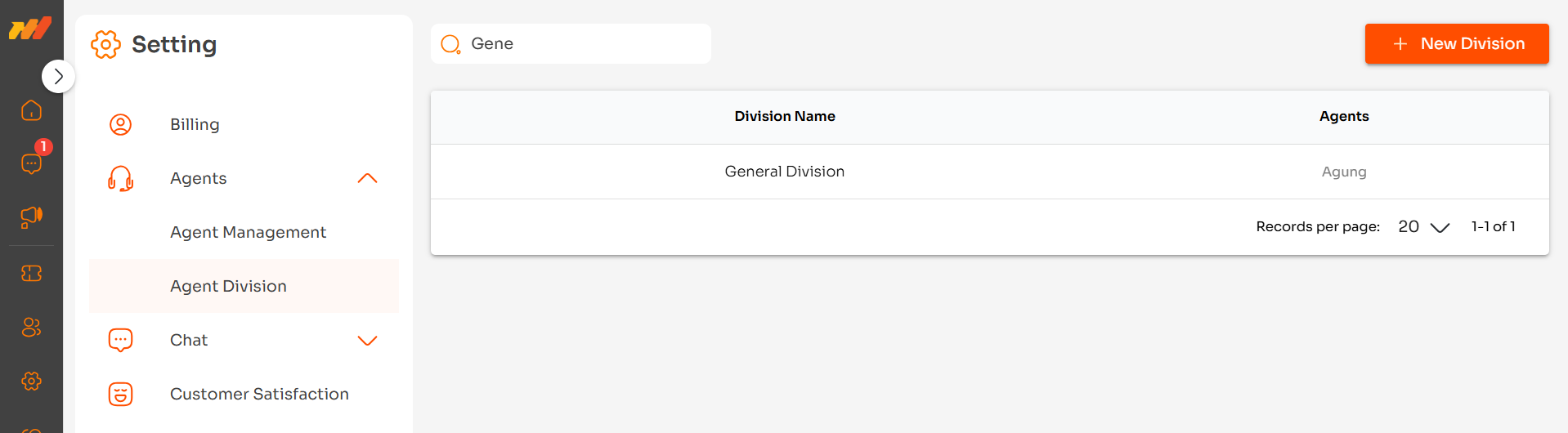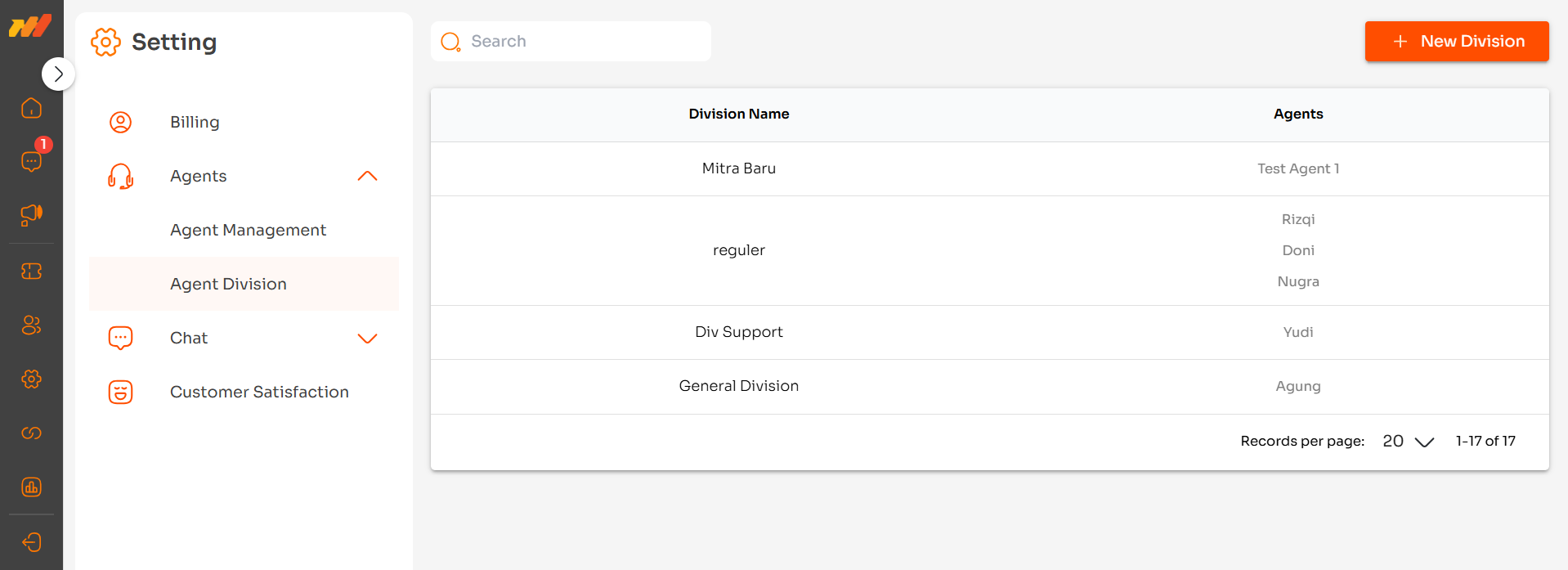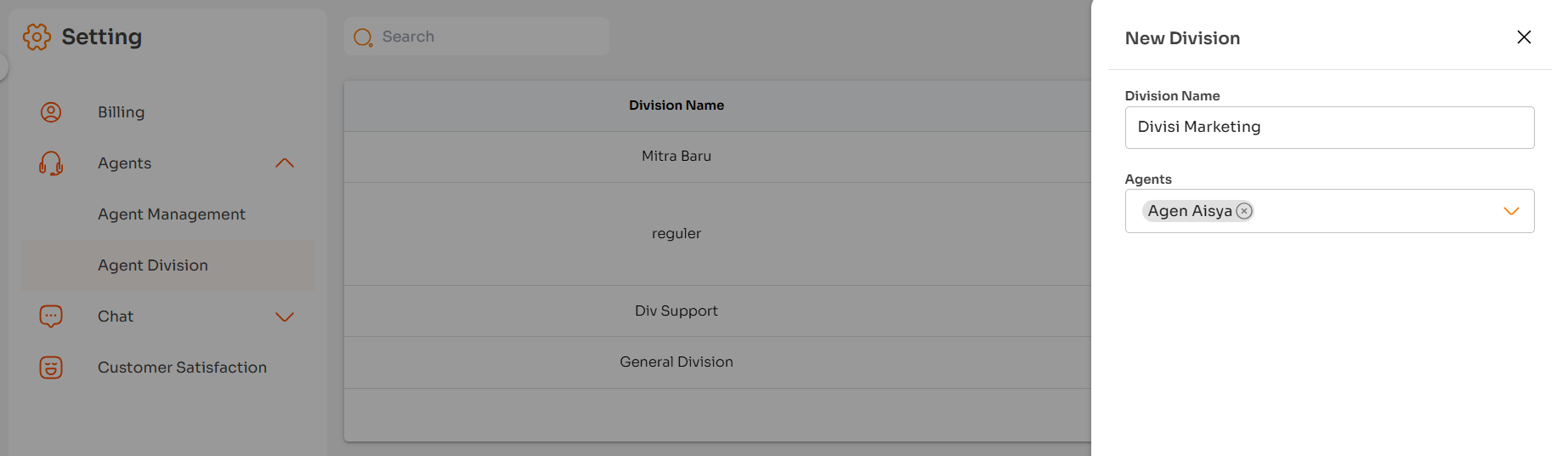 Pada sub-menu Agent Division, Anda dapat membentuk divisi. Divisi dapat berguna untuk mengelompokkan agen/admin sesuai dengan fungsionalitasnya. Selain itu, Selain itu, Anda juga dapat melakukan pengolahan data divisi, seperti menambahkan divisi baru, mengubah data, dan menghapus data divisi.
