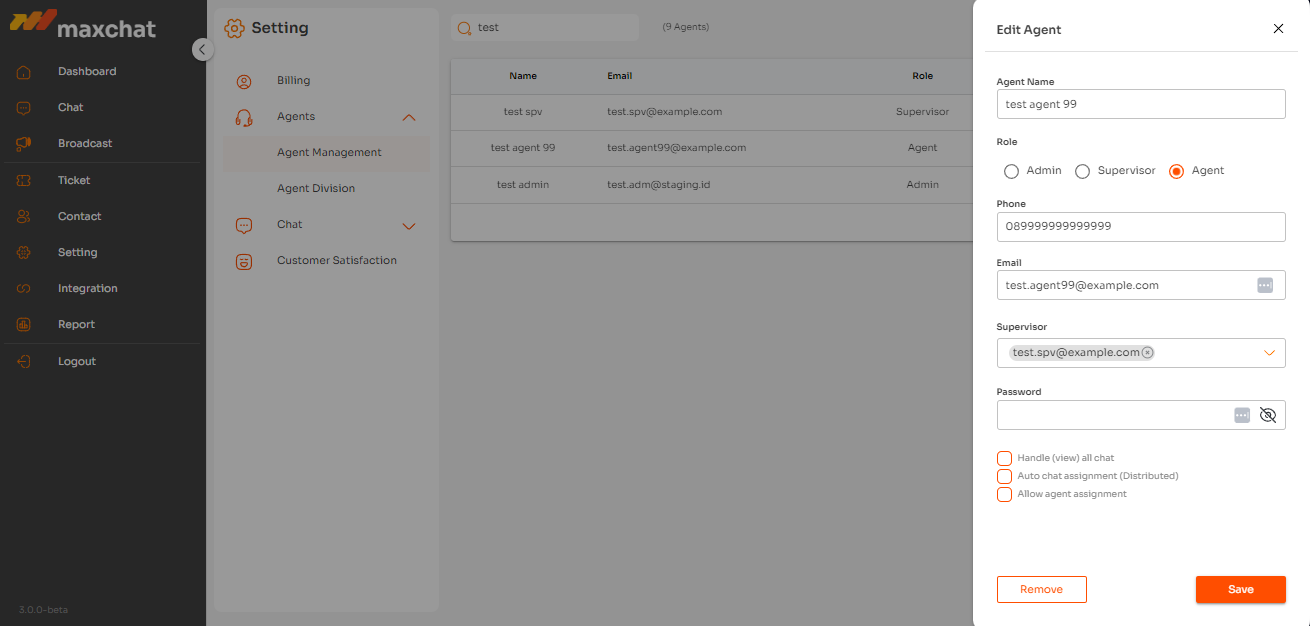 Selain menambah dan mengubah data, Anda dapat menghapus data Admin, Supervisor, dan Agent. Tombol Remove dapat Anda temui di dalam jendela Edit Admin, Supervisor, dan Agent.