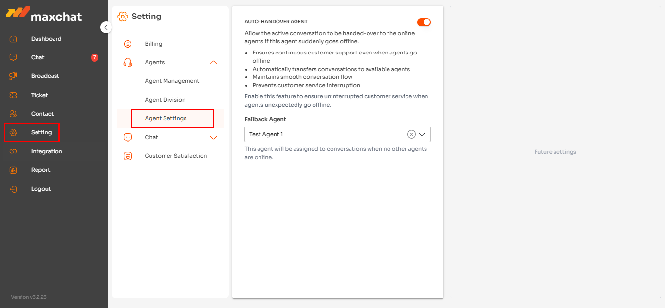 Pada sub-menu Agent Setting, Anda dapat mengatur **Auto-Handover Agent**. Fitur ini memungkinkan percakapan aktif secara otomatis dialihkan ke agen lain yang sedang online apabila agen yang sedang menangani percakapan tersebut tiba-tiba offline. Tujuan dari fitur ini adalah untuk memastikan layanan pelanggan tetap berjalan lancar dan tidak terganggu.