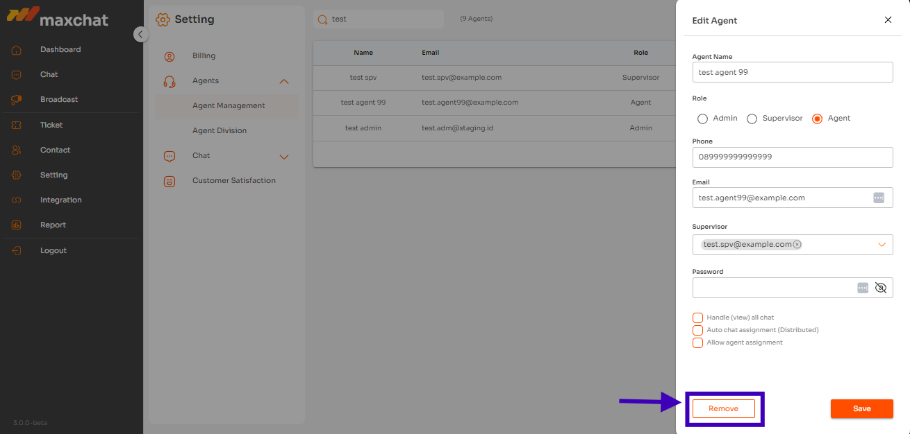 ### Remove Admin, Supervisor, dan Agent