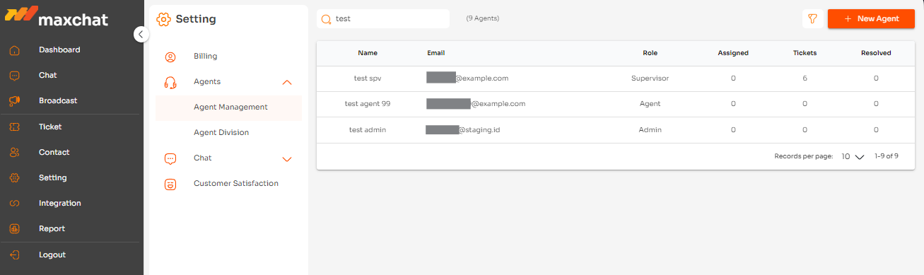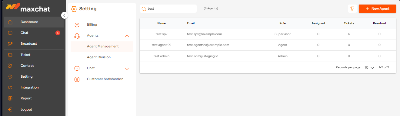 Anda dapat juga menambahkan Agen atau Admin baru melalui tombol <mark style="background-color:orange;">**+ New Agent**</mark>. Admin, Supervisor, atau Agent baru yang Anda tambahkan, akan muncul dalam tabel.